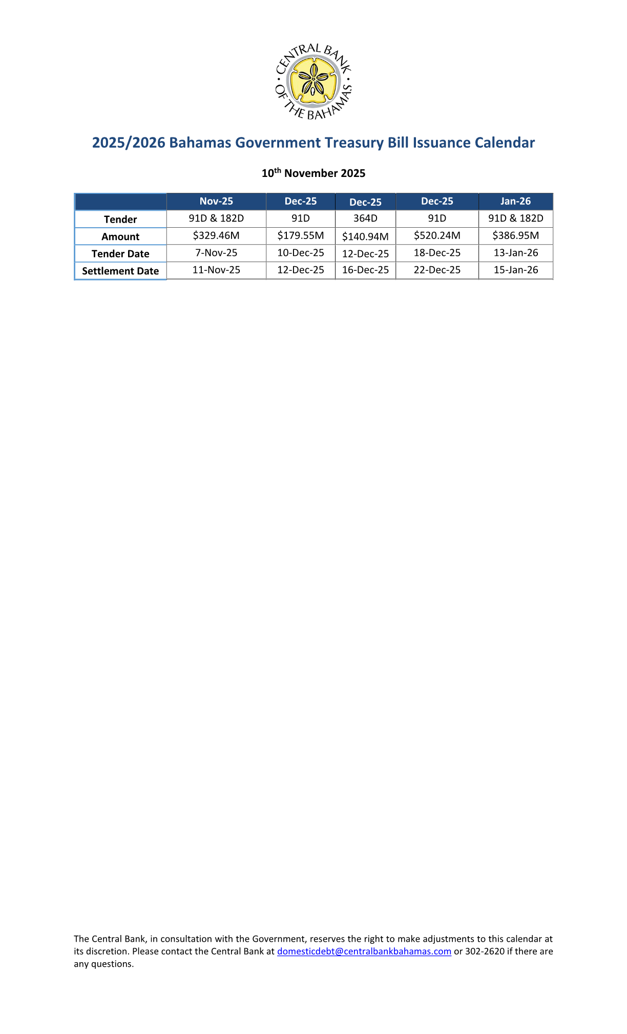 Treasury Bills Tender Quarterly Calendar - November 2025_January 2026